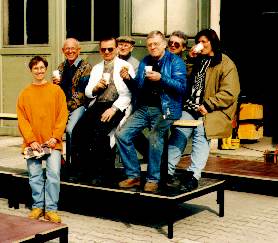 Der Schwerpunkt der Sängerinnen und Sänger...![]() In der weißen Weste: Chefkonstrukteur und -monteur Richard Schelter. ... darf in den längeren Passagen, in denen nur die Solisten tätig sind, auf Sitzen ruhen. Diese Konstruktion wurde - wie auch der ganze Unterbau - von engagierten Chormitgliedern in eigener Arbeit hergestellt. Das Foto unten zeigt die Crew während einer ersten Sitzprobe auf einem Teilstück des Podiums. |